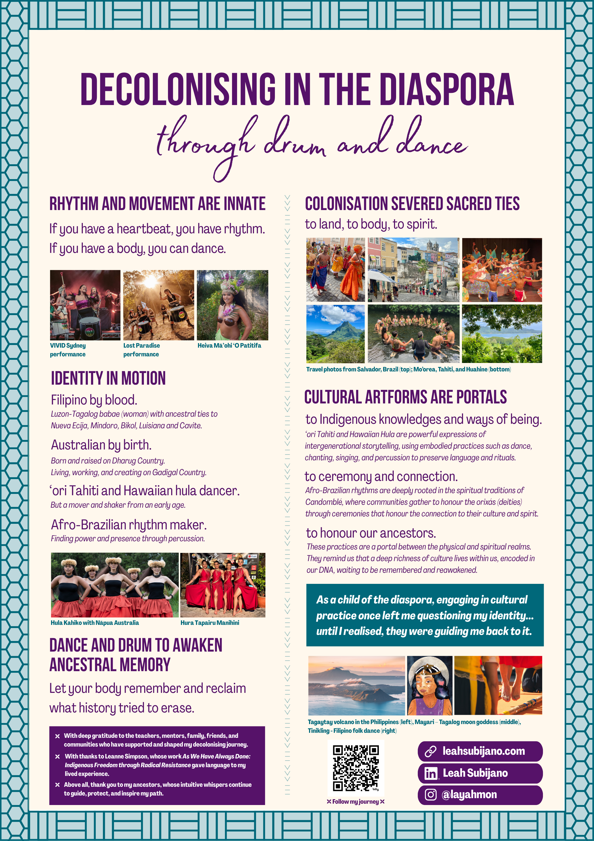 My poster presentation wove together many of these learnings and reflections. The journey to reconnect with my pre-colonial ancestral roots has been far from linear. It unfolded through creative practices such as ‘ori Tahiti (Tahitian dance) and Hawaiian hula with my dance school Nāpua Australia; and Afro-Brazilian drumming, with my women’s rhythm collective ILE ILU. Each of these art forms opens a doorway to a different way of being and knowing. These practices became conduits to Indigenous worldviews, calling me to connect more deeply with my roots and with spirit.